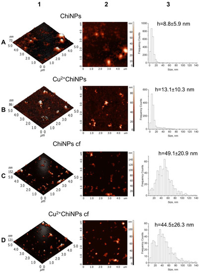 Dimensional characteristic of NPs. Column 1 (A1–D1)—3D AFM images of nanoparticles, column 2 (A2–D2)—2D AFM images of nanoparticles, column 3 (A3–D3)—histograms of the size distribution of nanoparticles and their average sizes according to AFM. Row A—ChiNPs, row B—Cu2+ChiNPs, row C—ChiNPs cf, row D—Cu2+ChiNPs cf.