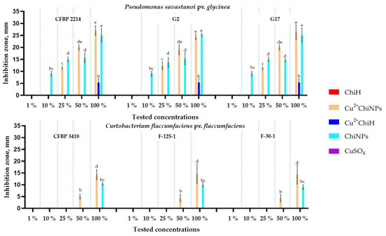 The diameters of the inhibition zones for each test substance, depending on the concentration of solutions against Psg and Cff strains (the average value for every strain of each bacterium) in an agar diffusion test. We added 100 µL of the sample to the well, and after 48 h of incubation at 28 °C, the zone of inhibition was measured. Different letters indicate a significant difference in values, according to Duncan’s test, at p = 0.05. All tests were carried out three times. The standard deviation (SD) is shown for each bar.