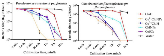 Time–kill curves for chitosan samples and CuSO4 for Psg CFBP 2214 and Cff CFBP 3418. A concentration of 1xMBC was used in all analyses. Error bars represent standard deviations (SDs) of the mean of the viable cells number (CFU/mL) for 3 independent repeats.