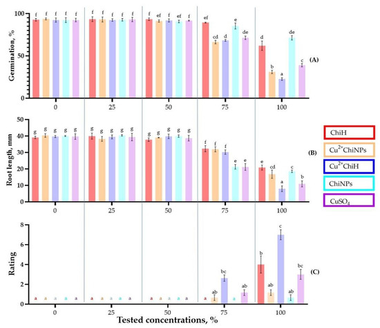 At 50% concentration of the samples (2.5 mg/mL of chitosan and 0.42 mg/mL of CuSO4), an insignificant decrease in germination and root length was observed. When treated at initial concentrations (5 mg/mL of chitosan and 0.83 mg/mL of CuSO4), Cu2+ChiH had the strongest reduction in seed germination, and ChiNPs had the least phytotoxic effect. Cu2+ChiH had the most toxic effect on root length, and ChiH was the least toxic. It is important that the inclusion of copper in the nanoparticles increased their antibacterial activity and reduced the phytotoxicity of copper.