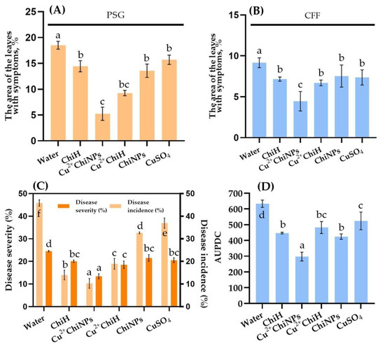 Chitosan samples reduced the degree of leaf lesions from Psg by 15–71% compared with water-treated controls (Figure 5A,B). Cu2+ChiNPs resulted in a 71% decrease in lesion area compared to controls, while Cu2+ChiH contributed only up to 50%. Treatment with CuSO4, ChiH and ChiNPs did not cause a significant reduction in leaf lesions (15–20%) compared to control.