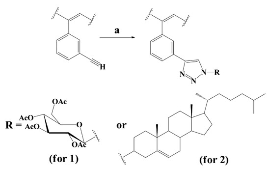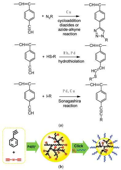 There are known click reactions of groups –C≡CH with various reagents. The same reactions can be recommended for modification of DEB polymers having side substituents –PhC≡CH, for example, reactions with aromatic diazides (cycloaddition azides) [34,35,36], the Sonogashira-Hagihara catalytic reaction with halogen derivatives [37,38] in accordance with the schemes in Figure 2a.