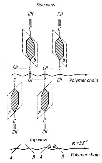 In article [41], it was first recorded that the crystals of p-DEB under UV or γ-irradiation in quartz cuvettes at 77 °K or at room temperature for at least 10 h acquire a yellow color. At the same time, the crystals did not change their shape, size, and surface. One of the two types of crystals formed, the darker one, showed strong dichroism. At room temperature, the irradiation was much more effective than at 77 °K. Mainly crosslinked insoluble products were formed. The soluble fraction was ≈10%. Based on optical measurements, the authors assumed that the polymer molecules formed consist of approximately 14 monomeric units. As one of the variants of the polymer chain structure, the authors proposed a linear polyene, because, in their opinion, “anisotropic absorption can be observed if predominantly one acetylene radical in each DEB molecule is involved in the polymerization reaction”. The authors consider that the reason for the termination of the photopolymerization process is the accumulation of mechanical stresses, which limit the conversion rate. However, in their opinion, the growing polymer chain does not lead to a violation of the crystal lattice of the monomer. Unfortunately, the intramolecular structure of the fractions has not been studied by any physicochemical methods, such as NMR and IR spectroscopy or the study of molecular weight distribution. The scheme of possible chain growth presented by the authors (Figure 4) is not correct, since it has an image of pentavalent carbon.