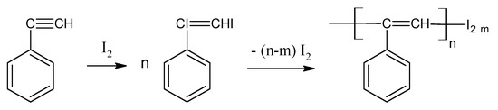 The authors believe that the polymerization mechanism first involves the process of halogenation, and then dehalopolycondensation in accordance with the scheme (Figure 5) on the example of polymerization of a structural analog—phenylacetylene.