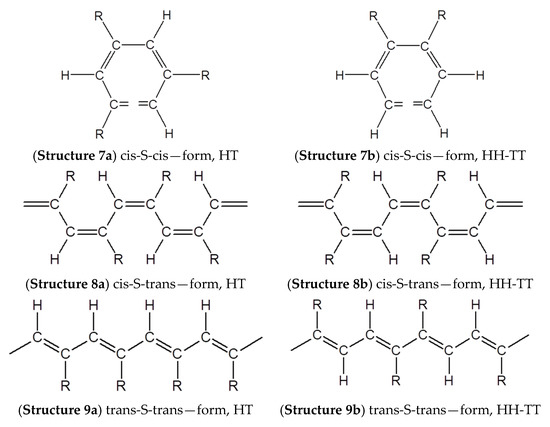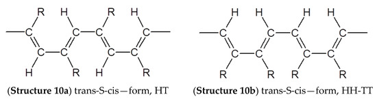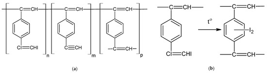 Films made of soluble poly-p-DEB had σ20 = 10−10 Ω−1cm−1. After heat treatment at 130 °C, the polymer became insoluble. The iodine content decreased to 27%, and the absorption bands characteristic of C–I and C≡C bonds disappeared. The authors explained this by the process of disappearance of links with substituents –CI=CHI in accordance with the scheme shown in Figure 6b.