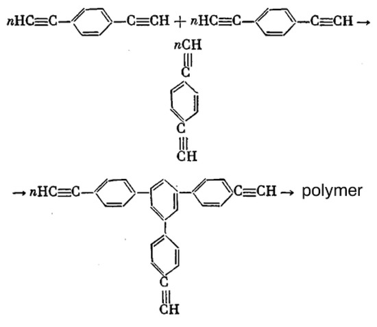 The first attempts at a liquid-phase synthesis of poly-p-DEB in the presence of catalytic systems are described in the patent [66] and in articles [67,68,69,70,71]. It was reported in [68,69] that in the presence of the iso-(C4H9)3Al—TiCl4 complex (Al/Ti = 0.5), an insoluble polymer is formed in 6 h with a yield of 40%. In [70], they only state the fact of the formation of an insoluble polymer in the presence of iso-(C4H9)3Al and TiCl4 without specifying any polymerization conditions. Nevertheless, the authors [70,72] believed that 1,2,4- or 1,3,5-cyclotrimerization of p-DEB occurs first, as was observed in the case of phenylacetylene [73]. Subsequently, the polymer mesh is formed according to the scheme (Figure 7).
