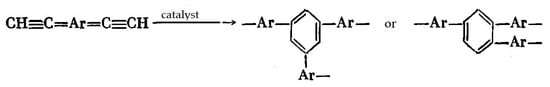 Indeed, the resin synthesized from a mixture of p- and m-DEP in the presence of or complexes is also formed due to the cyclotrimerization process (Figure 13) [23]. In addition, the cyclotrimerization of acetylenes in the presence of is indicated by the authors [24] who studied the co-cyclotrimerization of mixtures of DEB and ethylphenylacetylene isomers and proposed the branched cyclotrimer structure.