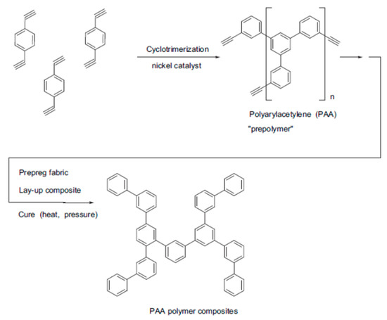 Synthesis of cyclotrimerized PAA prepolymer and subsequent processing steps to produce PAA polymer composites. Reprinted with permission from [64] Copyright 2009 Elsevier Ltd.