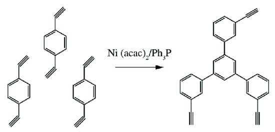 - Neenan, T.X.; Whitesides, G.M. Synthesis of high carbon materials from acetylenic precursors. Preparation of aromatic monomers bearing multiple ethynyl groups. J. Org. Chem. 1988, 53, 2489–2496. [Google Scholar] [CrossRef]
