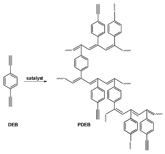 At the same time, polymers synthesized by polymerization of aromatic compounds with terminal ethynyl groups H–C≡C–Ar–C≡C–H acquire their specific properties, for example, 1,4–diethynylbenzene and 1,3-diethynylbenzene [12,13,14,15,16], 1,2-diethynylbenzene [17], 1,4-diethynyl naphthalene and 4,4′-diethynyldiphenylmethane [12], 4,4′-diethynylbiphenyl [12,14,18,19], 2,5-diethynylthiophene [20], 3,6-diethynylcarbazole [21], etc. The most frequently studied monomer of this group of compounds is p-diethynylbenzene (p-DEB), also due to the fact that it is the most commercially available compound. Initially, numerous patents and articles were devoted to the creation of homo- and copolymers based on p-DEB with the formation of prepolymer resins. These prepolymers are of interest, first of all, for the creation of specific heat-resistant and ablative materials for aviation and space technology [22,23,24,25,26,27,28]. In addition, homo- and copolymers with a complex of other interesting properties have been synthesized on the basis of DEB, for example, components of solar cells, optically active polymers, polymers with photoelectric and catalytic activity, microporous and electrochromic polymers, membranes for separating gases and liquids, humidity sensors, etc. Possible applications of synthesized polymers will be given below when considering various methods of their synthesis. Many approaches and various catalytic systems have been proposed for the synthesis of these polymers.