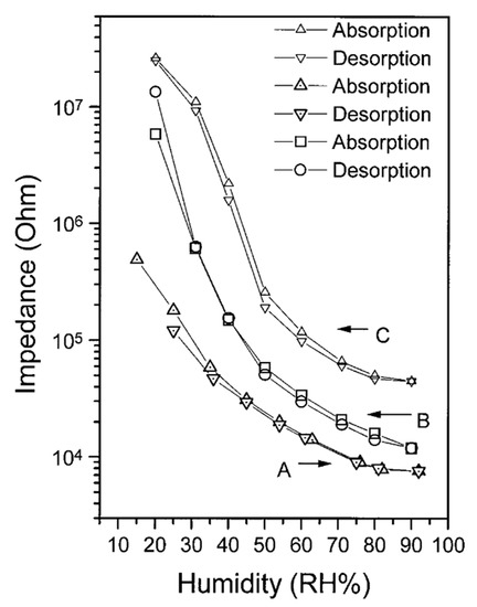 Humidity response of PDEB-based sensors (A, B, and C) prepared with different methods. Reprinted with permission from Ref. [95]. Copyright 1999 John Wiley and Sons, Inc.