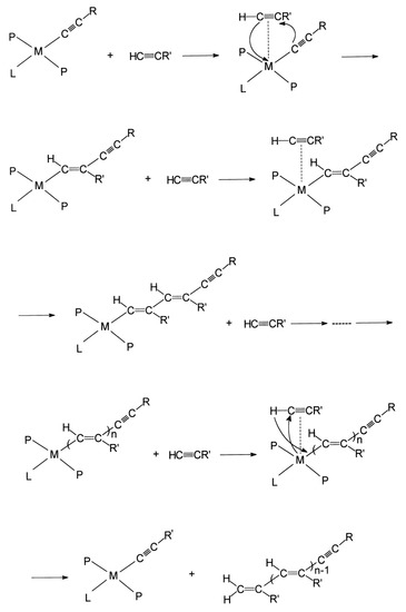 - Zhan, X.; Yang, M. Transition metal acetylide catalysts for polymerization of alkynes: 3. Polymerization mechanism. J. Mol. Catal. A Chem. 2001, 169, 57–62. [Google Scholar] [CrossRef]