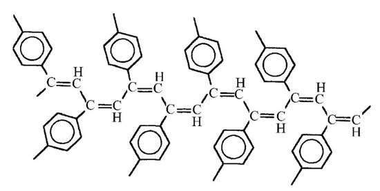 - Sergeev, V.A.; Chernomordik, Y.A.; Korshak, V.V. Synthesis and properties of polymers with polyvinylene-polyphenylene structure. Vysokomol. Soedin. Ser. B 1977, 19, 899–903. [Google Scholar]