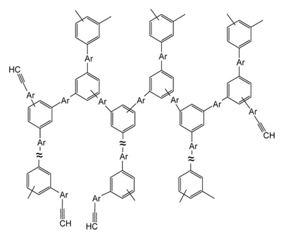 During polymerization of p-DEB and other diethynylaromatic monomers in the presence of rhodium catalysts [Rh(cod)ac] and [Rh(nbd)acac] (cod: cycloocta-1,5-diene; nbd: norborna-2,5-diene; acac: acetylacetone) in the medium of CH2Cl2, the authors [14] synthesized insoluble microporous polymers with yields of 80 and 85%, respectively. The polymers had SBET values of 512 and 809 m2 g−1, respectively, and a micropore volume of 0.160 and 0.247 cm3 g−1. The adsorption of H2 on polymers was reversible, in contrast to nitrogen adsorption. This allowed the authors to consider it possible to optimize the physical properties of polymers in order to create materials for gas storage. Using the SEC and 13C CP/MAS NMR spectroscopy, it was found that the polymer consisted of polyene conjugated meshes with ethynylarylene substituents and crosslinked with arylene linkers (Figure 14).