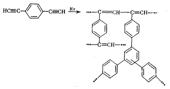 The patent [66] reported on the polycyclotrimerization reaction of diethynylarylenes using catalysts , (where R = AlkC≤6, Hal = Cl, Br, I). The goal is the synthesis of thermosetting polymers cured at 150–200 °C. However, only one example describes the synthesis of poly-p-DEB only in the presence of triethyl phosphate cobalt iodide complex . The yield of the insoluble polymer was 70.6% for 1 h in boiling ethanol. The IR spectrum of the crosslinked polyphenyl product shows the presence of trisubstituted benzene nuclei in the polymer molecule (at 810–850 cm−1).