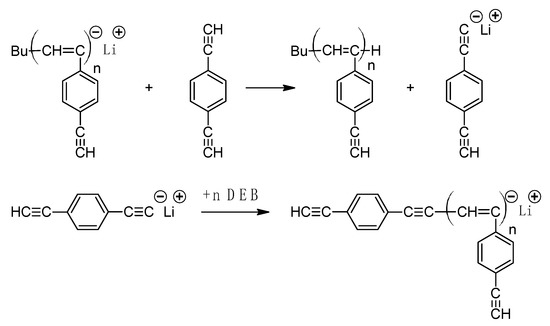 However, it must be kept in mind that DEB is a bifunctional monomer. Therefore, its homopolymerization can proceed both along one and both –C≡CH bonds with the formation of polymers of three different types of intramolecular structure: linear, branched, and crosslinked. In turn, the resulting structure of macromolecules will fundamentally affect the properties of the polymers being formed.
