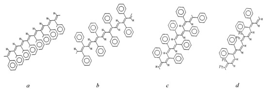The –PhC≡CH substituents are present in all types of intramolecular structures of DEB polymers in varying amounts. However, only in soluble linear or branched poly-p-DEBs is it possible to carry out an effective, controlled modification reaction. In addition, only in strictly linear DEB polymers, substituents—PhC≡CH should be present in each link of the polymer. Therefore, only in linear modified polymers, in principle, it is possible to realize a structure that is a poly-conjugate chain, along which there will be sufficiently extended clusters (Figure 3). For the synthesis of such cluster systems, it is possible to use any heteroatoms or molecular fragments introduced by modification reactions listed above (Figure 1 and Figure 2a). Thus, knowledge of the intramolecular structure of DEB polymers is important information necessary to assess the possibility of modification and possible areas of their application.