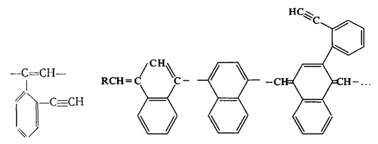 Unfortunately, in this article, the corresponding IR spectra were not given and the NMR spectra of poly-p-DEB were not taken, which would make it possible to determine the intramolecular structure of the polymer. Later, these authors reported in an article [30] that under the previously used [85,87] synthesis conditions, polymers are formed that “have a predominantly linear structure with a trans-transoid conformation and contain free ethynyl groups on almost every aromatic nucleus”. That is, in fact, the synthesized polymer had a certain number of branches in the main chain.