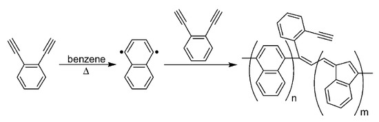 Heating (100–280 °C) in sealed ampoules in an argon medium of mixtures of p-DEB and polynaphthalene, anthracene, and polynaphthalene copolymer with benzene [57] and with polyphenylene (1/2 wt.) [58] led to the formation of either soluble or insoluble products. According to the authors (in accordance with the IR spectra), depending on the experimental conditions, p-DEB was grafted to polyarylenes (soluble products were obtained) or polyarylenes were crosslinked with grafted p-DEB with the formation of trans-vinyl bridges.