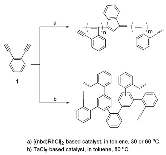 - Aso, C.; Kunitake, T.; Saiki, K. Studies on the polymerization of bifunctional monomers. XXI. Polymerization of o-diethinylbenzene. Macromol. Chem. Phys. 1972, 151, 265–274. [Google Scholar] [CrossRef]
