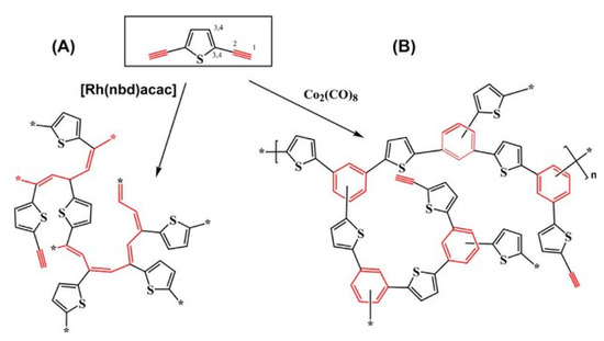 The soluble polymer was obtained only in the presence of a [Rh(nbd)acac] catalyst after 2–3 min (no more!) after the start of synthesis. The authors found that this poly-DEB was highly branched or partially crosslinked even at the beginning of its formation.