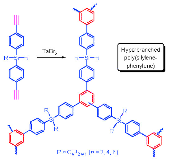 - Liu, J.; Zheng, R.; Tang, Y.; Häussler, M.; Lam, J.W.Y.; Qin, A.; Ye, M.; Hong, Y.; Gao, P.; Tang, B.Z. Hyperbranched Poly(silylenephenylenes) from Polycyclotrimerization of A2 -Type Diyne Monomers: Synthesis, Characterization, Structural Modeling, Thermal Stability, and Fluorescent Patterning. Macromolecules 2007, 40, 7473–7486. [Google Scholar] [CrossRef]