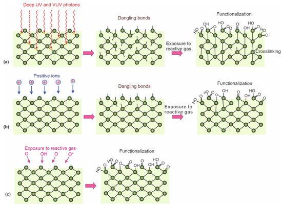 The nonequilibrium gaseous plasma is a source of different reactive species interacting with the surface, causing its modification. In addition to atomic and molecular species (ionized, excited, or neutral radicals), plasma is also a source of extensive radiation, with the energy of some photons above the binding energy of atoms in polymer materials. In particular, radiation in a deep ultraviolet range (with photon energy above 6 eV) is of particular importance because such photons are capable of breaking bonds in polymers and thus causing the formation of dangling bonds. The resulting surface dangling bonds (free radicals) further react with atoms or molecules to form new functional groups [55,56,57]. The effect of deep ultraviolet radiation is illustrated in Figure 2a. The irradiation does not cause significant polymer heating, so it is a preferred method for hydrophilizing heat-sensitive polymers. The photons absorbed by the bulk polymer cause bond scission, so cross-linking is a common effect of polymer irradiation by plasma photons.