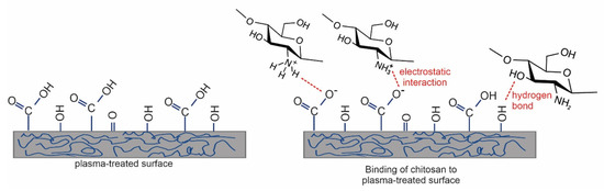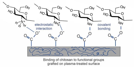 As already mentioned, the straightforward method for forming functional groups on polymer surfaces is treatment with nonequilibrium gaseous plasma, which benefits from one or more effects illustrated in Figure 2. Negatively charged surface functional groups are responsible for stabilizing the chitosan layer through noncovalent interactions such as electrostatic interactions [86,87,88]. In particular, carboxyl functional groups may interact with ammonium functional groups of chitosan, which are transformed into protonated NH3+ groups in acidic solutions [89]. There may also be hydrogen bonding between OH groups on the plasma-treated surface and OH groups of chitosan [87,88,89]. These interactions are schematically presented in Figure 3.