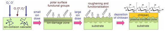Polymer materials are hydrophobic, which prevents good adhesion and uniform spreading of the deposited coating over the polymer surface. Therefore, polymer surfaces must first be activated with specific functional groups to ensure good adhesion of chitosan coatings. Chitosan consists of a polysaccharide network with amine NH2 groups, which can be protonated in an acidic environment, forming NH3+ [41]. The positively charged amine groups are suitable for electrostatic binding to negatively charged molecules [42]. Many synthetic polymers that are used for application in biomedicine exhibit a lack of negatively charged surface functional groups such as carboxyl groups. Therefore, chitosan will not stick well to the surface of such polymers. Adhesion of chitosan on polymers can be thus achieved by grafting the substrates with negatively charged molecules [43,44]. Various techniques are available for surface modification and establishing a dense and reasonably uniform distribution of surface functional groups, as well as modification of surface roughness, which may also have a beneficial effect on adhesion because of mechanical interlocking [2,45,46]. These methods include dry techniques such as plasma treatment, laser treatment, ion implantation, ultraviolet/ozone (UV/O3) treatment [2,45], and wet chemical treatment using oxidizing wet chemicals [46,47], which has an ecological drawback. Laser treatment causes rippling and formation of periodic surface structures. Laser radiation can break chemical bonds, which leads to the formation of reactive radicals that react with the surrounding atmosphere and form new functional groups [2]. Similarly, UV/ozone treatment also leads to bond dissociation through the absorption of UV photons, which react with ozone [45]. UV treatment followed by UV irradiation can also be used in combination with the exposure of a sample to a photo-initiator [46]. At the same time, ion implantation leads to the breaking of polymer chains and consequently to increased concentration of highly reactive radicals and changes in surface morphology [2].