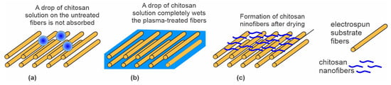 Jing et al. [59] also used low-pressure O2 plasma but without pulses of energetic ions. The authors treated polypropylene carbonate (PPC) microfibers prepared by electrospinning. The microfibers of an average diameter of 1.5 µm exhibited a rough surface with densely distributed cracks typically perpendicular to the length of the fibers. A possible application of these materials is as scaffolds in tissue engineering. The authors reported the O2 pressure during the plasma treatment to be as low as 0.04 Pa, achieved during continuous pumping and leakage of O2 at a flow rate of 50 sccm. If the reported pressure was correct and the samples were placed on the housing of the discharge chamber (not RF biased), the treatment involved a combination of effects illustrated in Figure 2a,c. This means that nonbiased samples are at a floating potential during plasma treatment, so the kinetic energy of positive ions is marginal, at approximately 10 eV. The treatment increased both C–OH and O=C–OH functional groups. The plasma-treated microfibers exhibited moderately hydrophilic properties. The WCA of the plasma-treated substrates was decreased to 51° after 5 s and to an immeasurably low value after 10 s. The water droplet was, therefore, soaked by the microfiber network. Oppositely, the WCA of the untreated sample remained at approximately 120° and was dried instead of being soaked (Figure 5a). The plasma-treated surface of PPC microfibers was suitable for grafting chitosan. Chitosan powder was dissolved in slightly acidic water, and the scaffolds were immersed in the chitosan solution for 2 min at room temperature. The soaked microfibers (Figure 5b) were then placed into liquid nitrogen, and deep-frozen samples were mounted in a vacuum chamber for drying. Using an innovative technique, the authors reported the formation of chitosan nanofibers with a diameter of around 250 nm on the surface of the microfibers (Figure 5c). The wettability of substrates grafted with chitosan nanofibers was significantly improved compared to plasma-treated microfibers. The soaking time was reduced by a factor of two or so. Therefore, Jing et al. [59] provided a procedure for optimal hydrophilicity of a chitosan coating: freeze drying of substrates soaked in a chitosan solution. The method used by Jing et al. [59] is illustrated in Figure 5.