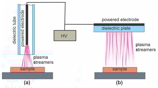 (a) The atmospheric plasma jet and (b) plasma sustained by dielectric barrier discharge (DBD) discharge with a high-voltage generator at a frequency below 10 kHz. The sample holder may or may not be grounded.