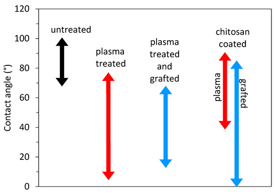 Reported wettability of the untreated substrate materials (black arrow), plasma-treated substrates (red), grafted substrates (blue), and chitosan-coated substrate (red for plasma-treated substrates and blue for grafted substrates).