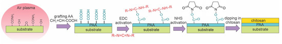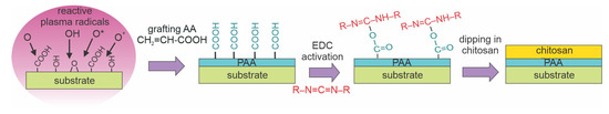 Recently, Karakurt et al. [44] reported the antibacterial properties of PLA films coated with a chitosan layer. Both a direct coating of the substrate and the usage of carbodiimide as an intermediate layer were reported. The samples were treated with low-pressure air plasma sustained with a capacitively coupled RF discharge at a power of 50 W. The air pressure was 60 Pa, and the treatment time was 60 s. PLA samples were placed on grounded metallic holders, and the discharge was sustained in an asymmetric configuration, so Figure 2c best illustrates the surface kinetics. The samples were incubated with acrylic acid to provide binding sites for the coating. Chitosan was covalently bonded to the substrates by dipping them into a complex chitosan-containing solution. The chitosan was adsorbed onto the pretreated substrates in the form of precipitates of the typical lateral dimension of several µm, as revealed in SEM images. They were 82° for untreated substrates and 46° after treatment with gaseous plasma. The WCA on samples coated with chitosan was approximately 65°. The plasma treatment caused the formation of several functional groups containing oxygen and/or nitrogen, as revealed by XPS. The nitrogen concentration in the surface film was approximately 3 at.%. The biocompatibility of chitosan-coated substrates increased significantly, and so did the antibacterial activity. Karakurt’s method [44] is illustrated in Figure 12.