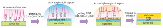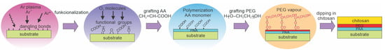 Pandiyaraj et al. [74] treated low-density polyethylene (LDPE) with Ar plasma. Plasma was sustained with a DC discharge, and the polymer foils were placed on the anode to keep them close to the floating potential. The DC discharge does not enable bombarding the insulating materials with energetic ions, so the surface kinetics were probably similar to those illustrated in Figure 2a. Plasma treatment lasted for 5 min. After turning off the Ar plasma, O2 was introduced into the plasma reactor. The authors explained surface hydrophilization as being due to the formation of dangling bonds upon treatment with Ar plasma. The bonds then reacted with oxygen to form functional groups, as illustrated in Figure 2b. Such a surface finish was useful for the next step, the deposition of a PAA film through plasma polymerization of acrylic acid. The samples were then grafted with polyethylene glycol (PEG) using the same reactor. A layer of PEG-resembling film acted as a spacer between the substrate and a layer of chitosan, which was deposited from an aqueous solution. This method is schematically illustrated in Figure 10. The water contact angle of untreated LDPE was 95° and dropped to 57° after plasma treatment. The WCA on the samples coated with a thin chitosan film was as low as 16° and remained low upon prolonged storage at ambient conditions. The WCA was 20° after 15 days. Samples were probed by AFM. Initial roughness was very low at an Ra of approximately 2 nm and increased to approximately 15 nm after Ar plasma treatment. It smoothened due to the deposition of the PAA film, increased to 15 nm after polymerization of PEG, and finally stabilized at 10 nm after chitosan immobilization. The authors reported excellent hemocompatibility because the platelets did not adhere to the chitosan-coated surfaces.