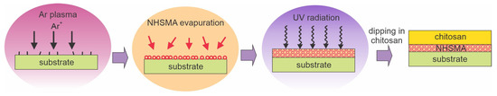 Tardajos et al. [76] reported the antibacterial properties of a chitosan film deposited on plasma-activated polycaprolactone (PCL) electrospun fibers using methacrylic acid N-hydroxysuccinimide (NHSMA) as an intermediate grafted layer. Plasma was sustained in Ar using a capacitively coupled discharge of 100 W. The plasma effect is best illustrated in Figure 2b. The best plasma treatment time was found to be 30 s, which enabled further grafting of the NHSMA and cross-linking using a 30 min exposure to UV radiation. The fibers grafted with cross-linked NHSMA were then incubated in a 0.5–1% chitosan solution in 0.1 M MES buffer at pH 5. The procedure enabled the immobilization of a thin chitosan film, which was qualitatively confirmed by coloration. XPS spectra indicated a composition similar to chitosan so that one can deduce a good coverage of the fibers. The chitosan coating enabled bacteriostatic properties. The relative growth measured a day after incubation was approximately 35% for S. aureus and 20% for S. Epidermidis. The Tardajos method [76] is illustrated in Figure 11.