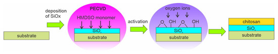 Opposite from the examples shown above, where the authors mostly used acrylic acid for grafting COOH groups, Li et al. [85] prepared multilayered PLA/SiOx/chitosan samples. First, the authors used the plasma-enhanced chemical vapor deposition (PECVD) method to deposit an intermediate layer of SiOx on the PLA surface. A SiOx layer was deposited using HDMSO monomer and O2 gas. After that, the SiOx layer was posttreated using oxygen bombardment for 30 or 60 s. The procedure is schematically presented in Figure 13. Such substrates were ready for further deposition of the chitosan layer using a bar coater. After drying, the thickness of the chitosan coating was 40 μm.