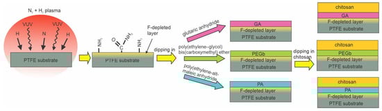 DBD discharge was also used by Vaz et al. [77]. They reported the antibacterial properties of polytetrafluorethylene (PTFE) substrates coated with a chitosan layer using various intermediate layers. The PTFE samples were exposed to plasma sustained in a mixture of 95 vol.% N2 and 5 vol.% H2 at atmospheric pressure. The voltage of 10 kV at the frequency of 3 Hz enabled plasma in streamers rather than a continuum flux of reactive species, as illustrated in Figure 6b. The plasma treatment caused fluorine depletion from the PTFE surface, and XPS analyses showed approximately 5 at.% of nitrogen. The partial substitution of the fluorine with amino groups is probably due to bond scission upon irradiation with vacuum ultraviolet radiation (VUV) and the interaction of the dangling bonds with NH2 radicals from gaseous plasma [101]. The presence of amino groups was proved by chemical titration. Amino groups formed by plasma treatment served as anchor sites for the further binding of three different spacer molecules, glutaric anhydride (GA), polyethylene–glycol biscarboxymethyl ether (PEGb), and polyethylene-alt-maleic anhydride (PA). Chitosan was then grafted onto these spacer molecules. The layer of immobilized chitosan enabled the antibacterial properties for X. fastidiosa of all samples, but the best results (only a few % survival compared to control samples) were observed when polyethylene-alt-maleic anhydride was used as a spacer. The method is illustrated in Figure 15. Compared to other reports, the key innovative step is the substitution of fluorine in the surface film of PTFE with amino groups instead of oxygen groups and the immobilization of chitosan using different spacers.