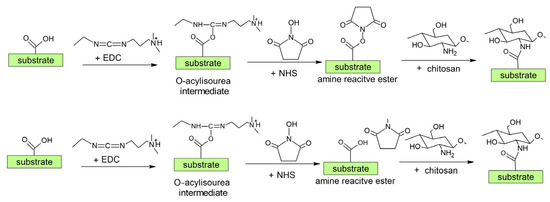 According to the literature review above (see also Table 2 and Figure 9 and Figure 12), we can conclude that at present, the most commonly used synthetic chemistry for coupling chitosan with a polymer is carbodiimide chemistry using EDC/NHS chemical agents [35,102]. The surface carboxylic acid group (from plasma treatment and polyacrylic acid grafting) is activated by the EDC reagent to produce an intermediate unstable group (Figure 16). This group is then transformed into a more stable NHS-activated carboxylic acid group, which is further coupled with the chitosan amino group [35,102]. It should be mentioned that the reaction selectivity of EDC could be questionable since it can react with the amino and hydroxyl groups. Moreover, because chitosan is a macromolecule, its steric hindrance may influence the coupling rate of chitosan [35]. This can lead to a lower and insufficient amount of chitosan on the surface.