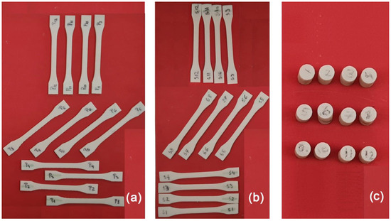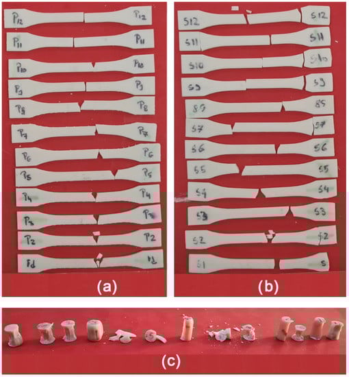 Specimens after the tests: (a) tensile specimens with 0.1 mm thickness, (b) tensile specimens with 0.05 mm thickness, and (c) compression specimens with 0.1 mm thickness.