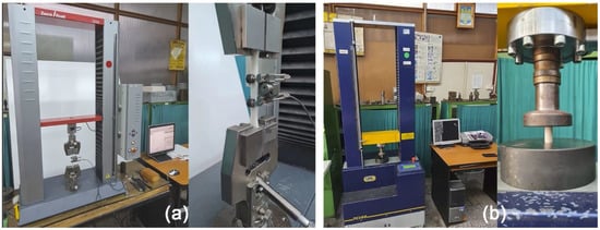 (a) Tensile test specimen mounted on the universal tensile/compression Zwick/Roell Z005 testing machine, and (b) A009 (TC100) universal testing machine.