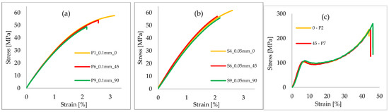Stress-strain curves for different printing directions (a) for the tensile test using specimens with 0.1 mm thickness, (b) for the tensile test using specimens with 0.05 mm thickness, and (c) for the compression test using specimens with 0.1 mm thickness.