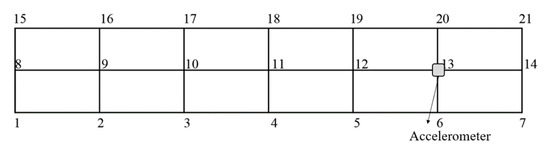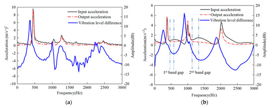 (2) The CFRP laminate with stacking prepreg can periodically reduce vibration amplitude and block vibration propagation. In the free-free end condition, the CFRP laminate with periodic structures had bending band gaps at 435–592 Hz and 1120–1400 Hz, and the maximum vibration amplitudes decreased by 5 dB and 10 dB, but the traditional CFRP laminate did not have a band gap. The CFRP laminate with periodic structures in the free state had a damping effect on bending vibration at 0–140 Hz.