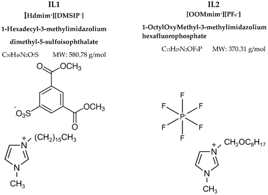 The structure of the ILs is reported in Figure 1. The synthesis of the ILs and their characterization by 1H Nuclear Magnetic Resonance spectroscopy (1H NMR) and Matrix-Assisted Laser Desorption Time of Flight Mass Spectrometry (MALDI TOF MS) analyses was previously described [20,21]. Both ILs were synthetized according to a two-step method.