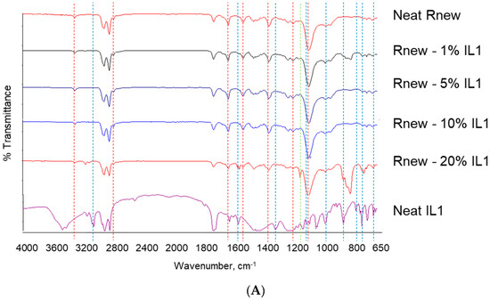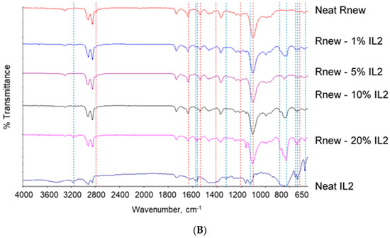 FT-IR spectra for Pebax®Rnew and Pebax®Rnew composite membranes. (A) Samples containing IL1 (HdmimDMSIP); (B) Samples containing IL2 (OOMmimPF6). Red dashed lines identify characteristic bands of the neat copolymer, while blue dashed lines identify characteristic bands of the neat ILs.