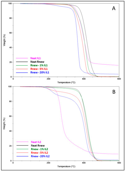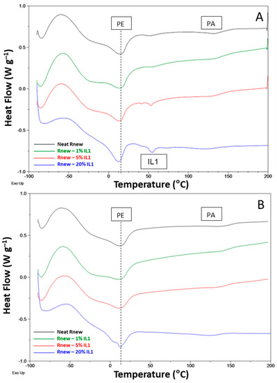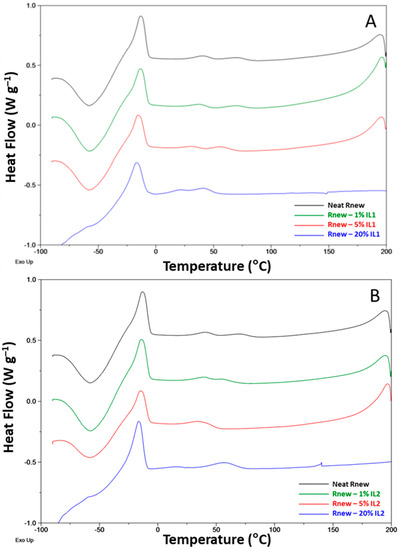 In general, IL addition to Rnew did not influence the positions of the melting and crystallization peaks; the slight shifts (1–5 °C) detected suggest no interaction and, consequently, phase separation between the polymer and the ILs.