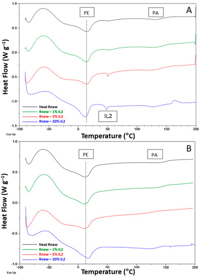 DSC traces for neat Pebax®Rnew and Pebax®Rnew–IL2 (OOMmimPF6) composite membranes. (A) First heating scan; (B) Second heating scan.