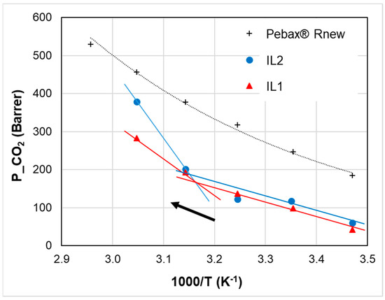 In the case of the composite membranes, the amount and type of the IL also affects the permeation parameters and the transport mechanisms (Table 2). At room temperature, the addition of increasing quantities of both ILs to Pebax® progressively decreased the overall gas permeability. Therefore, the solid ILs acted as impermeable fillers that were incorporated in the polymer matrix. The permeation rates of the tested gases in the composite films follow the same order as in the neat polymer, with CO2 being the most permeable species, as in the pristine polymer matrix (Table 2). On the other hand, CO2 molecules can also favorably interact with the cationic Imidazolium π system in the added ILs [38]. The nature of the anion in Imidazolium-based ILs has a key role in determining the affinity with CO2 [39,40]. Typically, ILs and PILs that comprise the PF6 anion display a good CO2 solubility [39]. In addition, the Sulfonic group in the DMSIP anion IL1 displays a strong affinity with CO2 via specific dipole–dipole interactions [28,41].