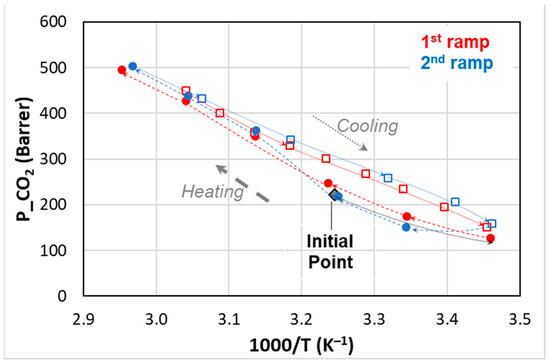 Temperature effect on CO2 permeability for Rnew–10% IL2 composite membrane. Closed symbols: heating; open symbols: cooling.
