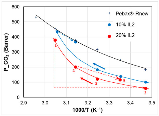 Temperature effect on CO2 permeability for Rnew (plus sign, +) and Rnew–IL2 (OOMmimPF6) composite membranes at 20% (red circles) and 10% IL (blue circles).