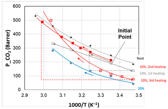 A permeability hysteresis was established for CO2, as shown by also recording the permeation fluxes during the cooling in a temperature range that included the IL Tm. Figure 11 describes the behavior of the sample loaded with 10% IL2 upon heating and cooling that was carried out with comparable heating and cooling rates.